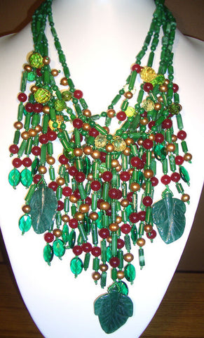 A fantastic one of a kind necklace. 5 strands of green coral tubes and balls with faceted green crystal ovals and yellow crystal briolettes and red jade balls. finished with 3 large green jade carved leaves(4×3cm). white gold plate clasp. 44cm long excluding drop. drop 14cm.