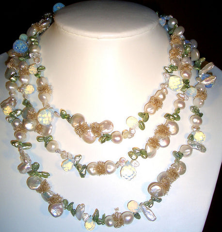 This unique item has 3 strands. All full of white freshwater pearls, coin pearls, sage green abormaility pearls, white biwa pearls, gold thread mesh and these lovely opalite crystal briolettes. White gold plate clasp. shortest strand 42cm. Large crystal 1.5cm long.