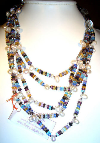 An exquisite 5 strands of faceted crystal rondelles hues of blue, purple and gold with white freshwater pearls. On one side this continues round to meet the white gold plate clasp where as on the other side the 5 strands disappear into one strand. You will just be able to see this in the photo. This single strand hides mostly behind the neck and is made of alternating smooth fume and faceted rock quartz. The pearls measure approx 1cm long. shortest length is 46cm.