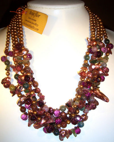 This is an amazing long 5 strand necklace. A real classic. Beautiful copper brown freshwater pearls with green jade balls, mauve purple briolette crystals(1cm long), tourmaline chips and mauve keshi pearls. White gold plate bar clasp. 58cm long.