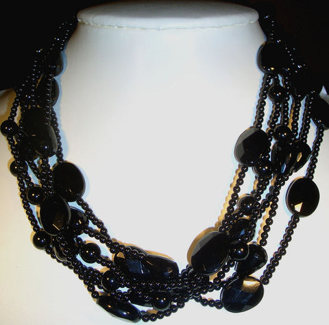 This necklace is a personal favourite because of the quality and shear simplicity. It is 100% black onyx. Mostly faceted, some not. The big black ovals measure just under 2 cm in length. It has a gold plate clasp. This necklace can be worn with almost anything and feels wonderful. 48cm long. 6 strands.