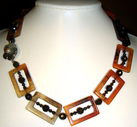 this great little number is made of carved agate rectangles and faceted blackonyx so it has a real sparkle. The clasp is a beautiful mother of pearl carved flower with a pearl in the middle. This has a white gold plate back. The clasp can be worn at the front, the side(as pictured) or at the back out of sight. 52cm long. rectangles measure 3.5×2.5cm.