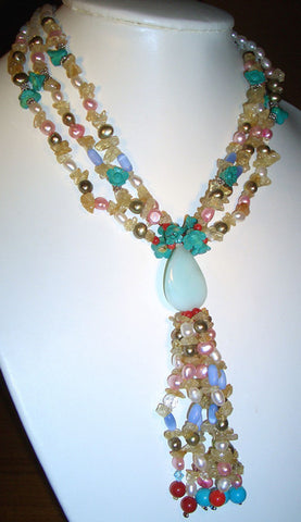 Lovely 3 strands of white pearls, brown pearls, carved turquoise flowers, pink pearls, red coral balls, blue opalite, citrine chips… and a large jade teardrop(3.5cm). white gold plate clasp. 42cm excluding drop.